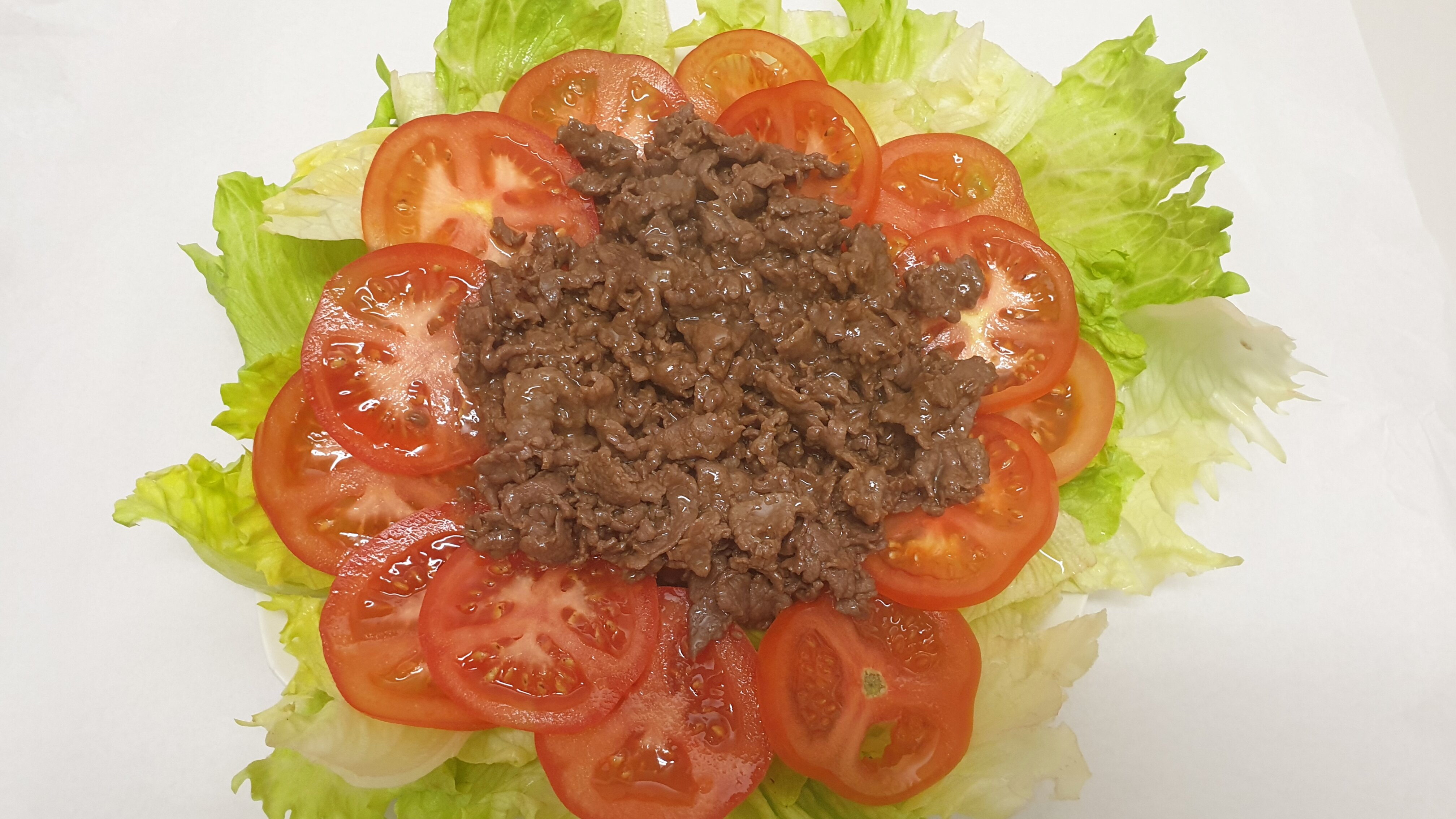 Stir Fried Beef with soy sauce, fish sauce, oyster sauce, black pepper on top of iceberg lettuce and tomato.